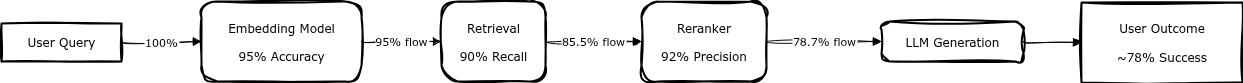 The diagram illustrates error compounding in a typical RAG pipeline. Each component’s failure probability multiplies, creating a “probability leak” where system-level performance degrades faster than component metrics suggest.