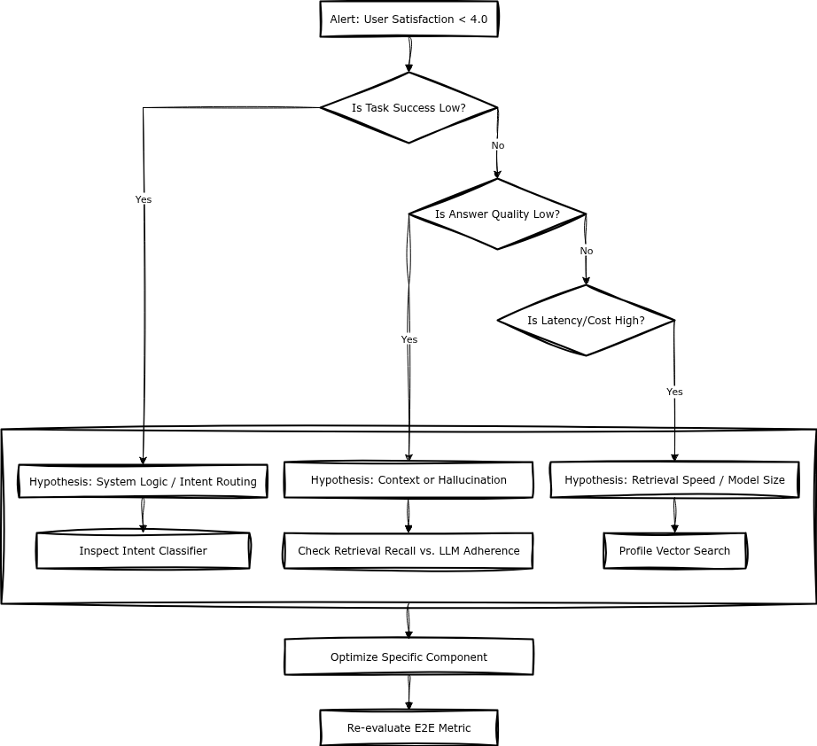 To avoid wasted engineering effort, evaluation should work backwards from the business metric. Do not start by asking “How do we improve retrieval?” Start by asking “Why is the Task Success Rate low?” and drill down until the technical bottleneck is isolated.